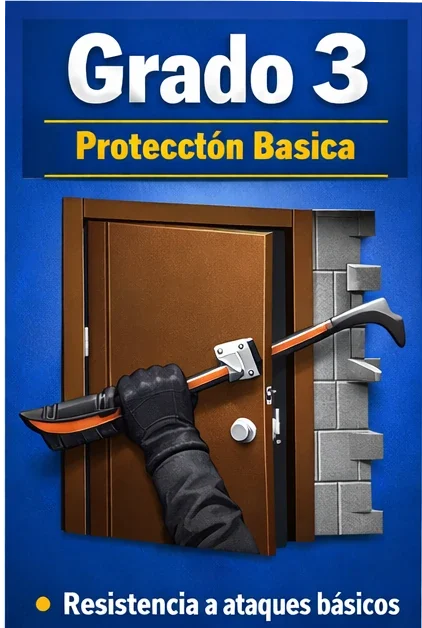Una puerta de Grado 3 está diseñada para resistir ataques de ladrones ocasionales que utilizan herramientas manuales sencillas (destornilladores, palancas, martillos o cuñas).