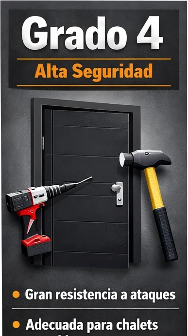 - Resistencia real: Una puerta de Grado 4 debe resistir ataques violentos durante un tiempo prolongado, generando un nivel de ruido y esfuerzo que disuade a cualquier intruso.
